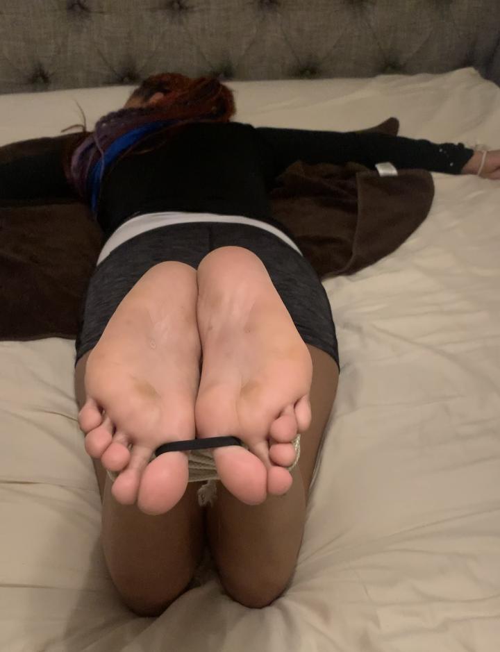 Ashley Howard returns to her master in need of some cash. She reached out to him very late and even agreed to wait till after he finished with another submissive to make sure she would be seen. She starts the clip in the spread tie position with her ankles bound and her tennis shoes with no socks on covering her size 8.5 Ebony soles. Her shoes are removed leaving her sweaty feet ready to be whipped. The strokes start very light but once Master Fetish Legend ties Ashley’s two big toes together to restrict movement of the feet, the punishment picks up quickly and Ashley struggles to keep her soles in position for her master but does a good enough job to not receive additional punishment. The strokes continues one after another across the shiny sweaty Ebony soles of Ashley pleasing her master in the process. The spread tie position brings out the best of her slave feet and this Bastinado session is reminding her just how little control she has when she is bound and beaten with a whip by her master. At the end of the session to add humiliation into the mix, Ashley thanks her master for each stroke and lets him know she’s ready for the next one. This lasts for 15 strokes in which you hear Ashley grunt repeatedly during the exchange. Because the clip was shot in vertical format it is being discounted :).