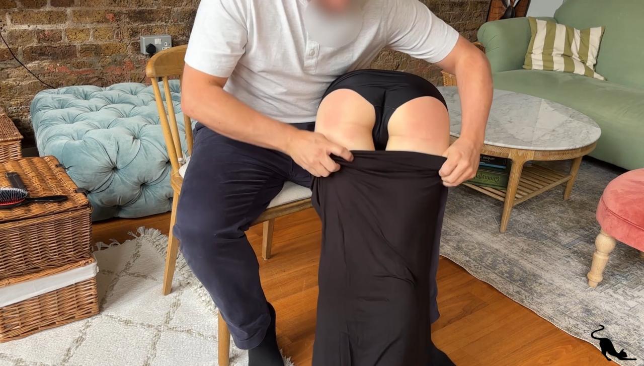 This clip is a recent custom where the instructions were simple. Kinia was to be spanked over the knee with the hand and the hairbrush. First over her skirt and then on the bare. A no nonesense spanking from beginning to end.