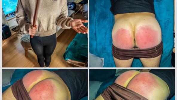 I recently had to order a new punishment pillow – a special cushion that lifts and perfectly presents my bare bottom. Madam D couldn’t wait to try it out and didn’t hold back at all. First came the leather and wooden paddles and straps in quick succession, then the big heavy paddle, and finally a serious hairbrush finale. It hurt a lot, but as you know, I obey and hold position. If you love seeing a bottom nicely raised and thoroughly punished without mercy, this video is for you!